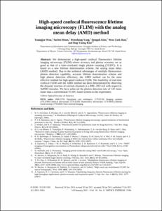 - We demonstrate a high-speed confocal fluorescence lifetime imaging microscopy (FLIM) whose accuracy and photon economy are as good as that of a time-correlated single photon counting (TCSPC). It is based on a new lifetime determination scheme, the analog mean delay (AMD) method. Due to the technical advantages of multiple fluorescence photon detection capability, accurate lifetime determination scheme and high photon detection efficiency, the AMD method can be the most effective method for high-speed confocal FLIM. The feasibility of real-time confocal FLIM with the AMD method has been demonstrated by observing the dynamic reaction of calcium channels in a RBL-2H3 cell with respect to 4 alpha PDD stimulus. We have achieved the photon detection rate of 125 times faster than a conventional TCSPC based system in this experiment. (C) 2011 Optical Society of America